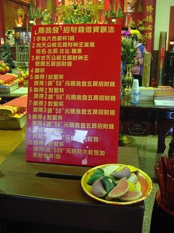 天公祖廟也裡面有個類似 竹山 紫南宮 一樣跟土地公借發財金的做法,唯一不同的是在天公祖廟借發財金必須先去櫃記登記再擲筊看看五路財神王是否同意讓你借發財金,當五路財神王同意後就要拿著一個塑膠盤子上面放有綠紅黃白黑共六對的聖筊,代表五方五色五路財誠心祈求,擲得一聖杯,可獲一路招財錢(58)二聖杯獲得二路招財錢,擲得六聖杯獲得588大紅包及招財金牌。媽還告訴我他上次來求的時候得了五個聖筊也得到了一個金牌,結果我今天看到好像是業務員的兩男兩女也來求財,其中一個女的竟然得了六個聖筊也得到了一個金牌,真是超有福氣的!